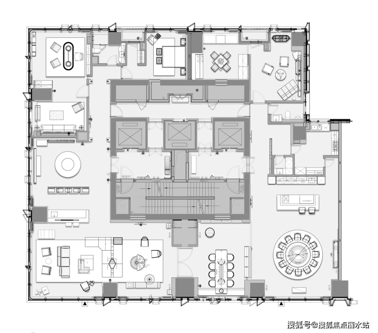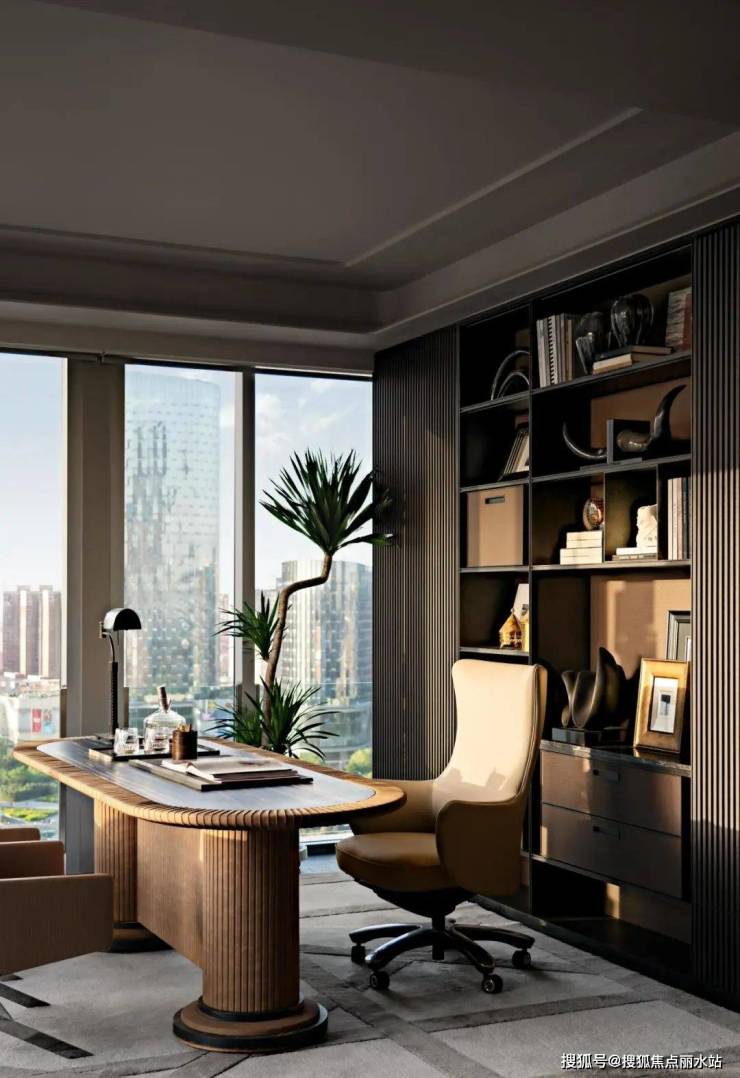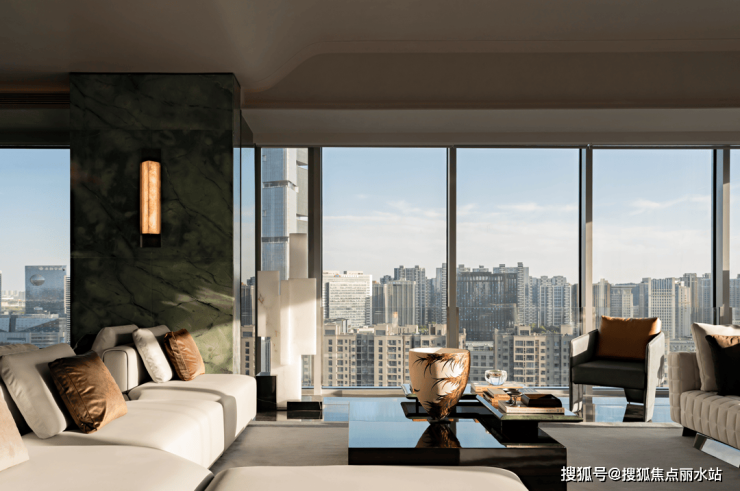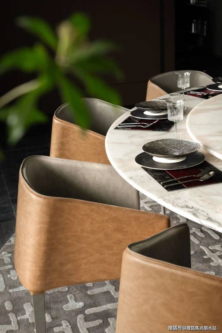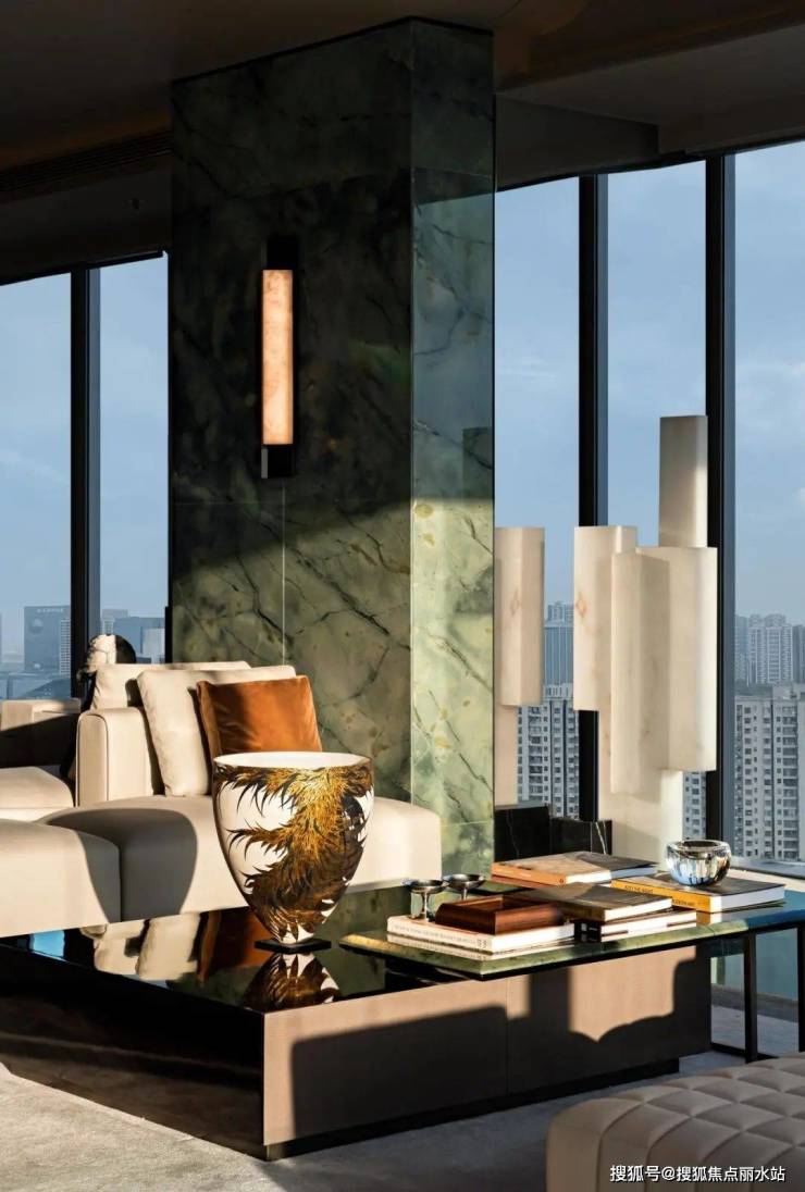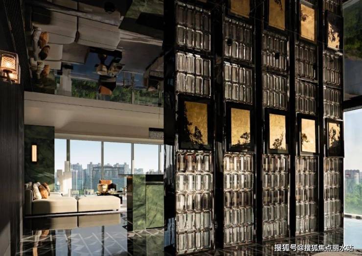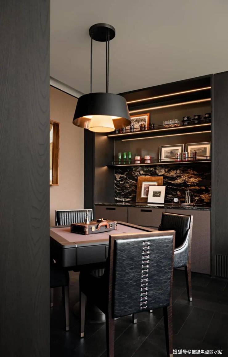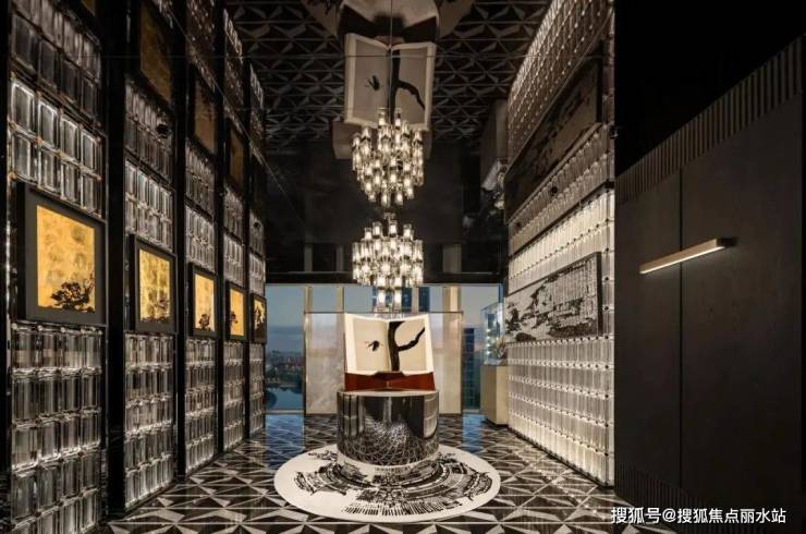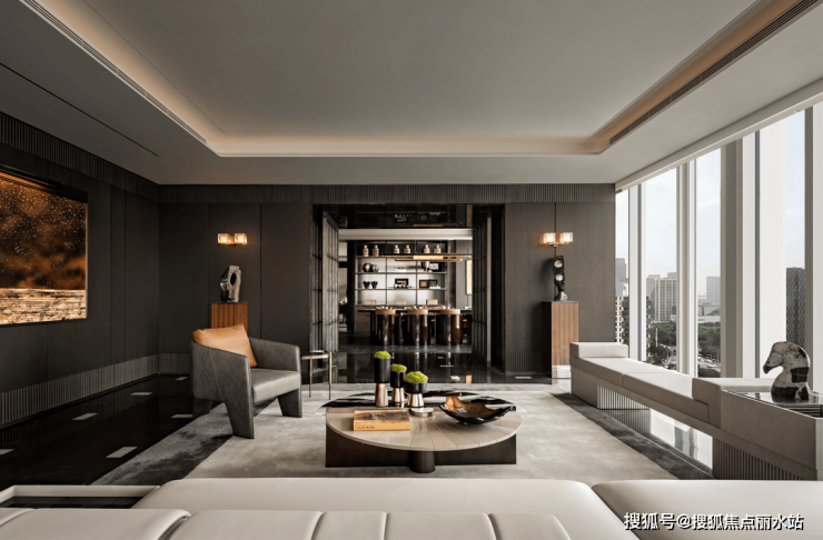 从空间到文化的升维表达:无界复合场景,两套户型打通后,围绕核心筒展开茶室、私宴区、影音室与270°观景廊,通过“洄游动线”串联功能,实现商务宴请、艺术沙龙、家族聚会的自由切换。
