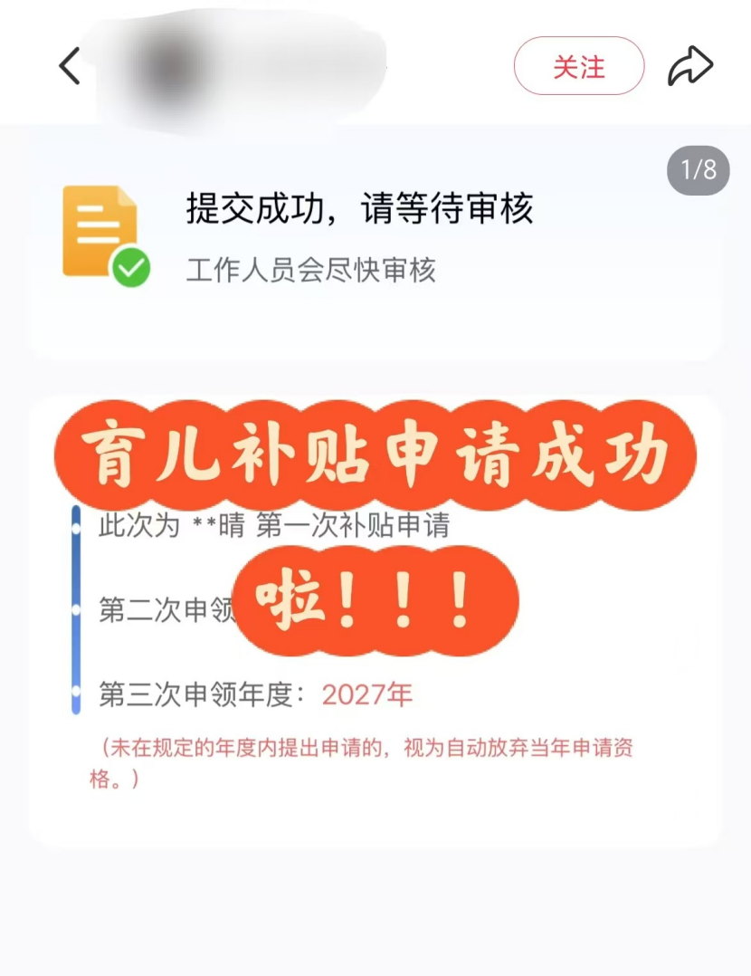 此外,支付宝和微信的“育儿补贴”小程序已上线,不少网友在社交媒体晒出自己成功提交育儿补贴申领的截图。