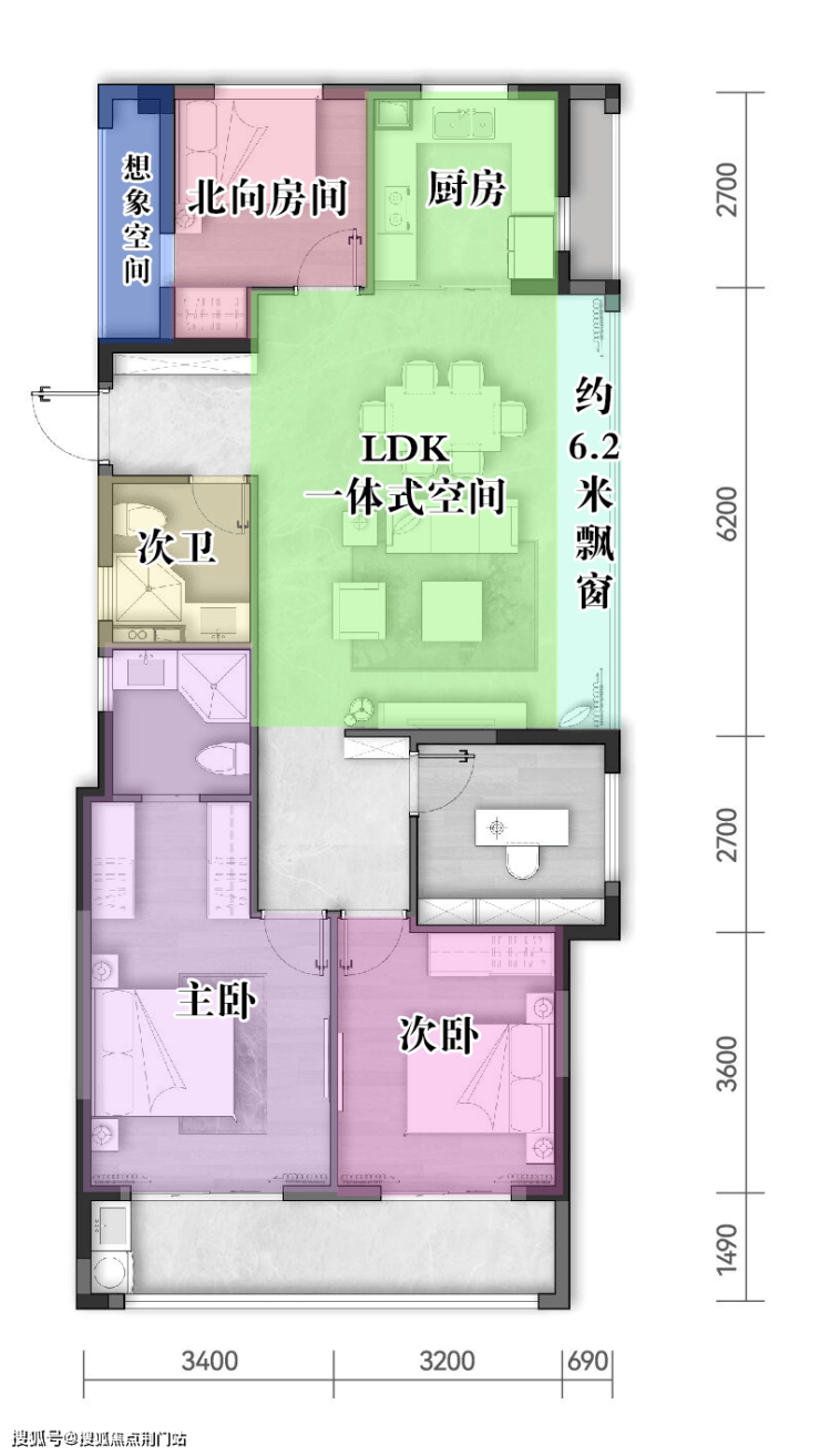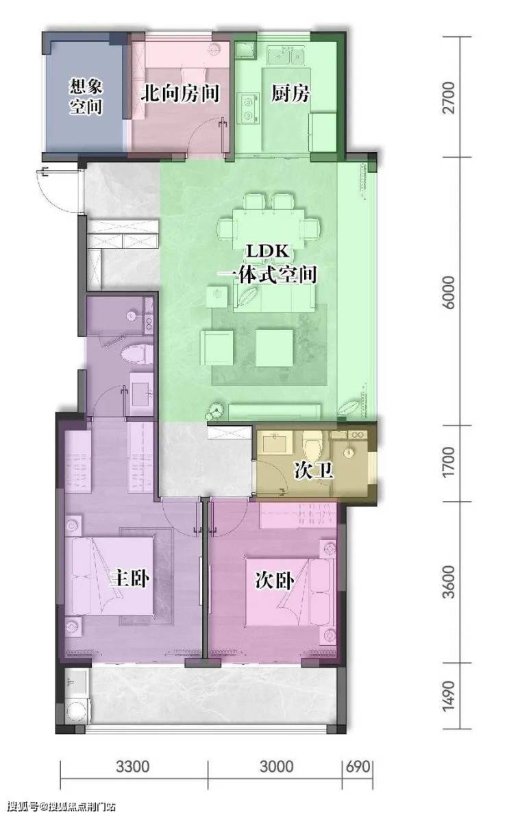 建面约109㎡的户型:与南向面宽等长的双开间阳台,轻松实现主、次卧的阳光平权;一体式LDK+约6米飘窗台,空间游刃有余、张力十足;独立储蓄空间是“家的收纳师”,让生活秩序井然、得心应手。