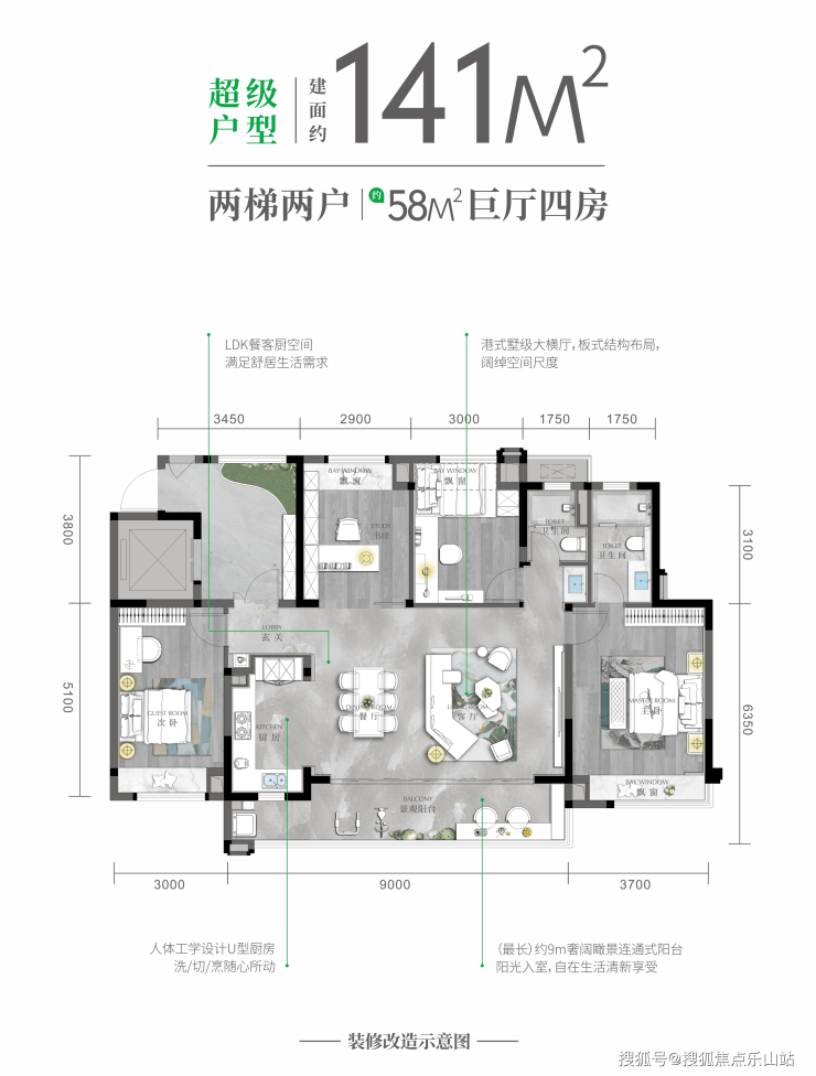 141㎡户型迭代升级,配备四大主题架空层(会客/儿童/休闲/健身)。
