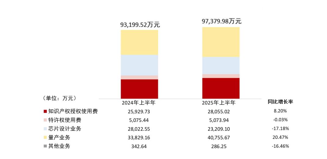 2025年上半年,芯原股份知识产权授权使用费为2.81亿元,同比增长8.20%;特许使用费为5073.94万元,同比下降0.03%。