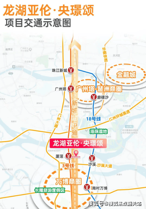 央璟颂交通极为便捷,与珠江新城距离近,且有 3 号线和 18 号线双地铁加持。距离沙溪地铁站约 600 – 700 米,搭乘 18 号线,1 站到万博,2 站到琶洲,3 站直达珠江新城。厦滘地铁站距离约 1 公里,3 号线覆盖海珠、珠江新城、体育中心、天河北、东站等多个核心区域。自驾出行同样轻松,华快和新光快速助力,上下班时段从项目到珠江新城 IGC 仅需约 20 分钟,为业主的日常通勤与出行提供了极大便利。