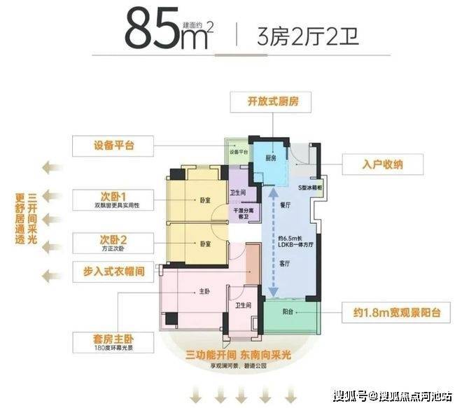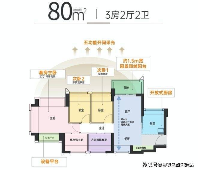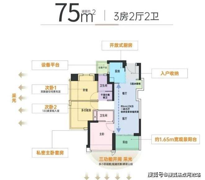 新规升级75㎡做2卫,市场同面积做1卫,卧室180度环幕采光,S型墙体设计冰箱位,使用空间更合理,干湿分离两空间公卫,兼并走廊空间更宽阔,客餐厅一体化设。
