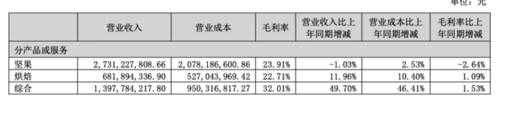 分产品或服务来看,上半年,三只松鼠的坚果产品营收为27.31亿元,同比下降1.03%;烘焙产品营收6.82亿元,同比增长11.96%;“综合”营收为13.98亿元,同比增长49.70%。
