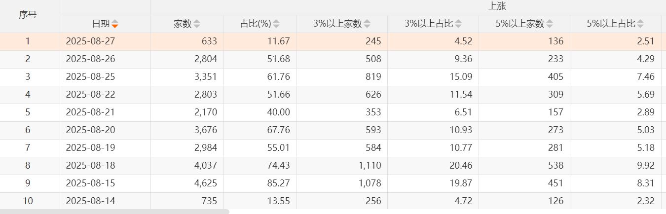在8月14日至8月27日的10个交易日里,8月14日、8月27日,全市场均为不足800只个股上涨。其余交易日中只有8月15日有超过85%的个股上涨,大部分时候涨跌各半,加大了操作难度。