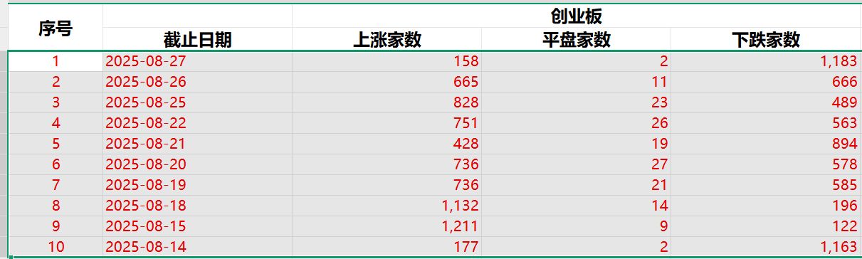 8月14日至27日这十个交易日中,创业板只有8月15日、18日下跌家数不足200家。8月27日沪指尾盘跳水,当天创业板下跌家数多达1183家。