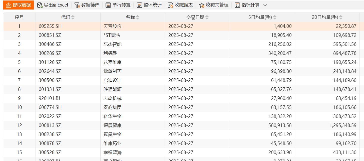 此外,东方财富Choice金融终端数据显示,截至8月27日,以20日均量和5日均量比较,有284只个股明显缩量,多数集中在中小创、北交所个股,如下图所示。