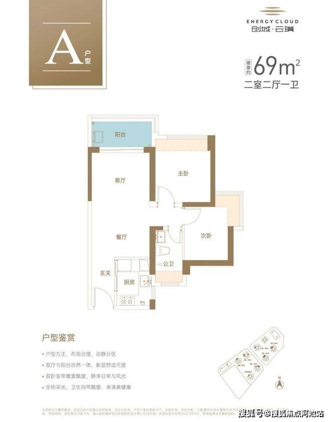 69㎡的2房2厅1卫,设计的是竖厅格局,客厅3.3米开间,LDKB一体化设计,2个卧室分别做到了主卧9.76㎡/次卧7.77㎡(实测面积,去掉墙体),U型厨房,卫生间干湿分离,得房率约73.29-73.86%(不含赠送),西北朝向。