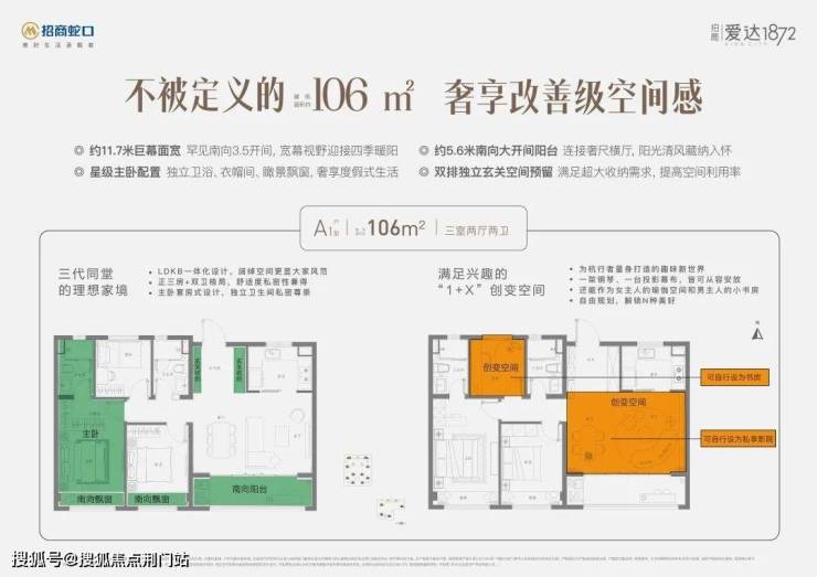 与常见的中间套户型不同, 招商爱达1872的约106㎡,南向有3.5开间,面宽约有11.7米。