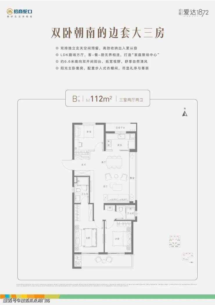 建面约112㎡的三房两卫,是双卧朝南的边套全明大三房, 适合家庭人口少,但对居住舒适度要求高、且有一定经济实力的购房者。