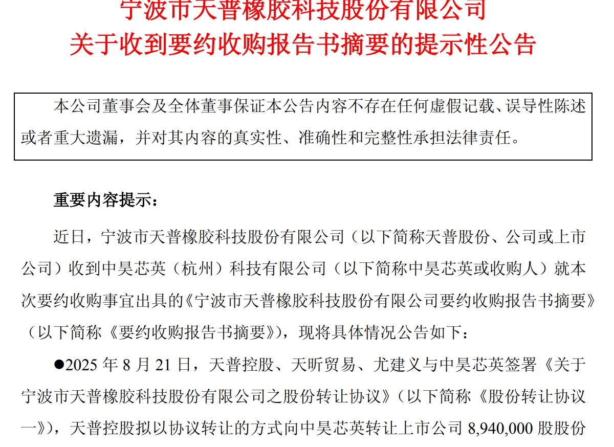 一周前的8月21日晚间,天普股份公告称,中昊芯英(杭州)科技有限公司(以下简称“中昊芯英”)将作为主导收购方,拟通过“股权转让+增资控股股东+全面要约”的组合方式,取得天普股份的实际控制权。