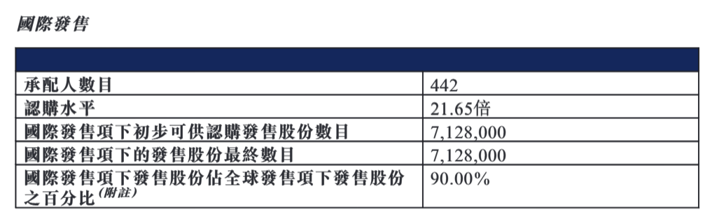 国际发售同样也比较火热,公司此次共向442名承配人发售股份,获得约21.65倍认购。