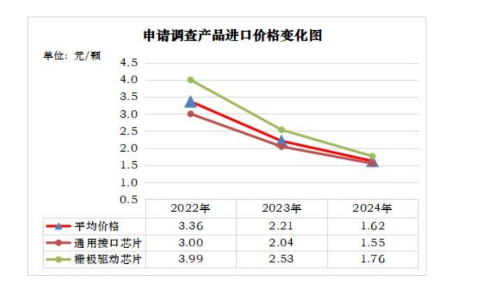 比如,美国相关通用接口芯片从2022年3.00元/颗降至2023年2.04元/颗,2024年则为1.55元/颗,2024年较2022年累计降幅48.33%。而栅极驱动芯片也从2022年3.99元/颗降至2023年2.53元/颗,2024年为1.76元/颗,2024年较2022年累计降幅55.85%。
