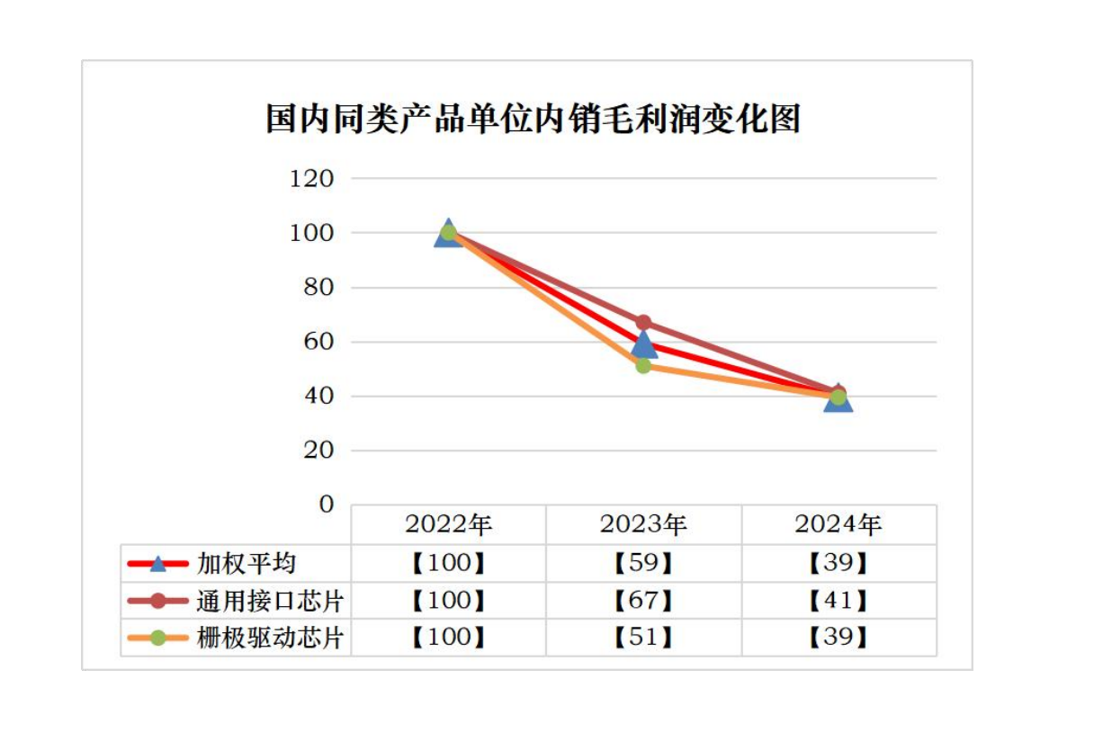 相较之下,通用接口芯片国内价格2024年较2022年累计降33.59%,栅极驱动芯片累计降22.13%,且国内价格降幅始终低于进口产品,国内企业陷入“被动跟跌”的市场困境。2024年相比2023年,国内产业同类产品的加权平均单位内销毛利润下降33.41%,其中通用接口芯片的单位内销毛利润下降38.76%,栅极驱动芯片的单位内销毛利润下降22.68%,获利能力大幅下降。