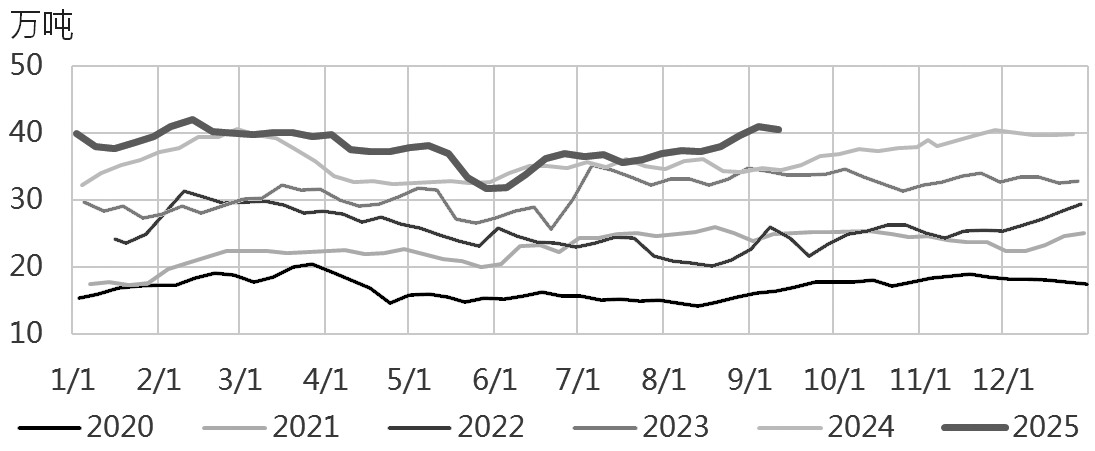 终端织造方面,截至9月11日当周,终端织造订单天数均值为14.55天,环比增加0.66天。织造企业原料库存和织造成品库存均有所下降。需求持续小幅回暖,织造行业产能利用率整体回升。值得注意的是,大部分国内服装工厂8月初就开始集中采购面料,9月之后以补充订单或小订单为主,大订单较少,市场交投气氛一般。从外贸情况来看,秋冬订单、圣诞订单稳步回升,市场交投气氛升温,但受东南亚工厂报价偏低影响,目前较多常规订单尚未落地。短期来看,织造企业产能利用率稳定,需求暂未出现明显改善迹象。