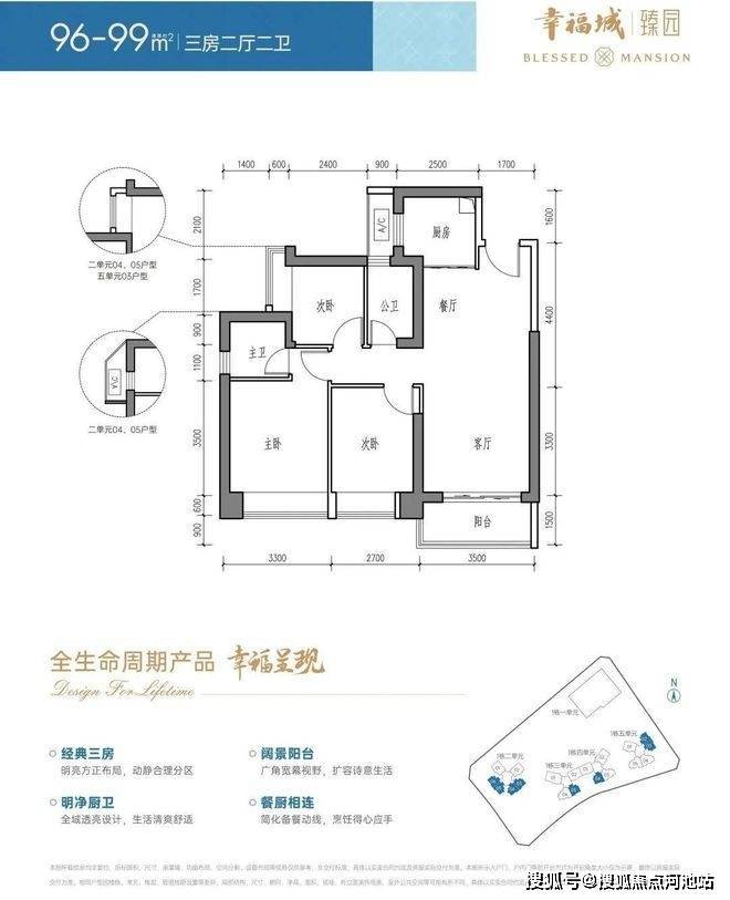 96-99㎡的3房2厅2卫,设计的是经典竖厅格局,客厅3.5米开间,LDKB一体化设计,动静分区,3个卧室分别做到了主卧14.63㎡/次卧11.07㎡/次卧7.26㎡(包含墙体飘窗),U型厨房,卫生间干湿分离,得房率约81-84%(包含赠送),东南/西南或东北朝向。