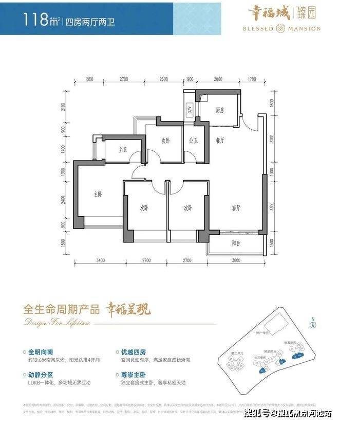 118㎡的4房2厅2卫,设计的是经典竖厅格局,进门入户玄关,客厅3.8米开间,LDKB一体化设计,动静分区,四开间朝南,4个卧室分别做到了主卧16.18㎡/次卧10.53㎡/次卧10.53㎡/次卧7.66㎡(包含墙体飘窗),U型厨房,卫生间干湿分离,得房率约84.02%(包含赠送),东南朝向。