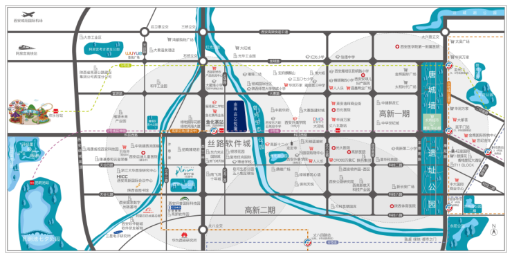 ▲生态:项目东侧紧邻贯穿高新区南北的“皂河生态公园”,同时毗邻唐城墙遗址公园,西安人才公园等大型都市生态核心。