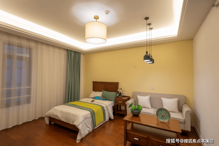 适老细节渗透每个角落:地面零高差设计、风雨连廊贯通全域,雨天出行无需撑伞;宽尺电梯、圆角家具、防滑地板消除安全隐患;床头与卫浴间的紧急呼叫按钮,搭配不活动报警系统,时刻守护日常安全。公共区域更见匠心:苏式园林中的休憩亭台、阅览室里的落地书架、康复区的适老器械,每一处都兼顾功能性与美感,让空间成为生活的延伸。