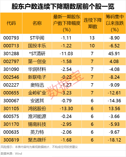 股东户数连降期数较长的有ST华闻、国投丰乐等,其中,ST华闻最新股东户数为6.24万户,已连续减少13期,累计降幅为15.38%;国投丰乐股东户数连降10期,最新户数为6.65万户,累计降幅15.73%,股东户数连降期数较多的还有ST清研、金岭矿业、新联电子等。股东户数连续下降的个股中,最新一期的股东户数降幅较大的有鸿铭股份、ST清研、神州泰岳等,最新股东户数分别下降13.30%、11.03%、10.27%。