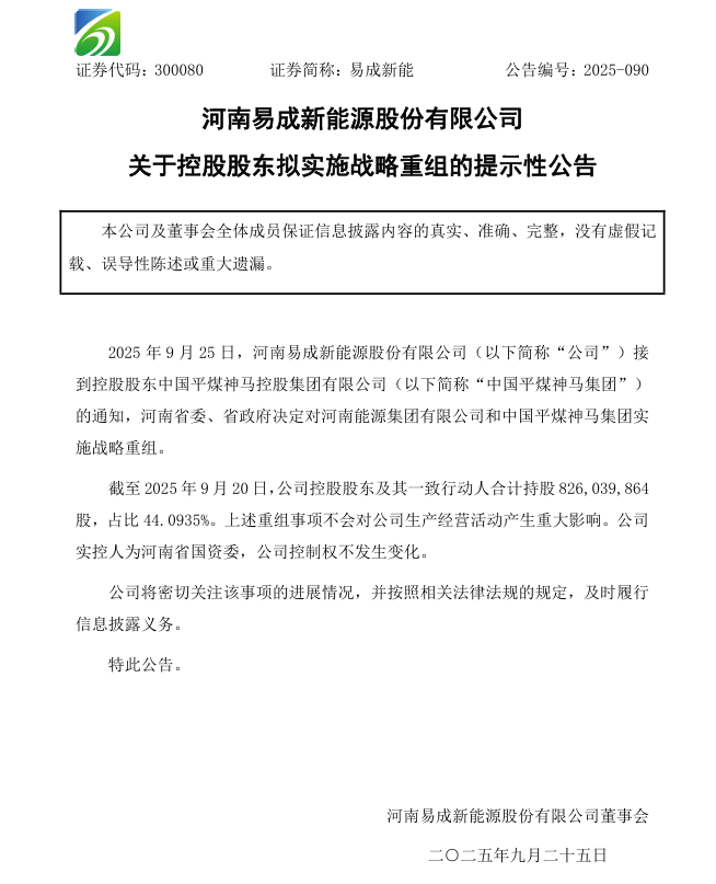 易成新能9月25日晚间公告称,公司接到控股股东中国平煤神马集团的通知,河南省委、省政府决定对河南能源集团和中国平煤神马集团实施战略重组。截至9月20日,中国平煤神马集团及其一致行动人合计持股约为8.26亿股,占比44.0935%。上述重组事项不会对公司生产经营活动产生重大影响。公司实控人为河南省国资委,公司控制权不发生变化。