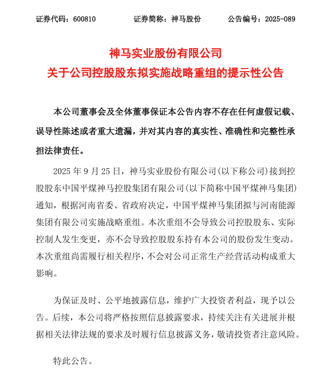 神马股份9月25日晚间公告称,公司接到控股股东中国平煤神马集团通知,根据河南省委、省政府决定,中国平煤神马集团拟与河南能源集团实施战略重组。本次重组不会导致公司控股股东、实际控制人发生变更,也不会导致控股股东持有公司的股份发生变动。本次重组尚需履行相关程序,不会对公司正常生产经营活动构成重大影响。