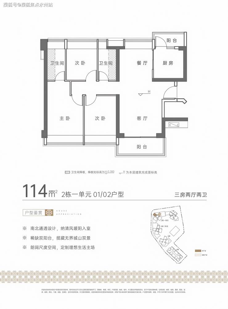 114㎡的3房2厅2卫,设计的是竖厅南北通透格局,进门独立玄关,客厅3.85米开间,三开间朝南,3个卧室分别做到了3.25米/2.75米/2.75米的宽度,主卧大套间设计,U型厨房,还带1个小生活阳台,得房率约73.64%(不含赠送),客厅阳台主朝东南或西南向。