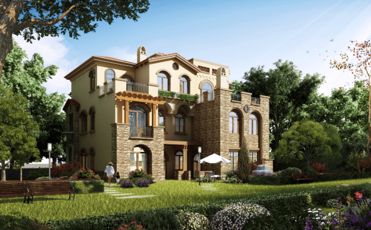 立面设计:采用米黄色石材与质感涂料,搭配深红色陶瓦坡屋顶、弧形阳台与镂空花格栏杆,形成层次丰富、光影斑驳的立面效果。别墅产品增加石材基座与木质百叶,强化质感与私密性。