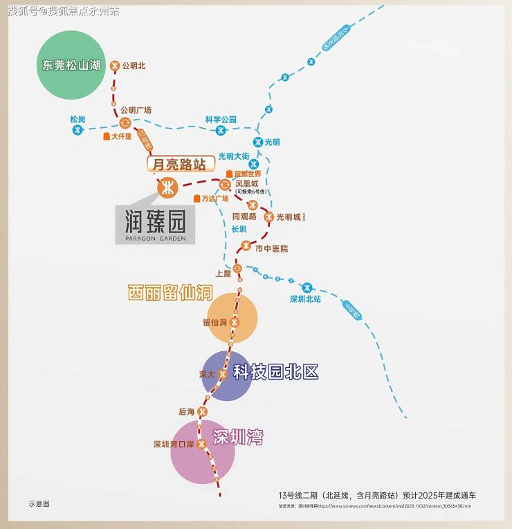 项目距离约600m到即达地铁13号线月亮路站,1站凤凰城,9站到南山,2025年将推动13号线二期(北延)建成通车(信息来源:宝安日报)。且未来还规划有18号线、29号线等。