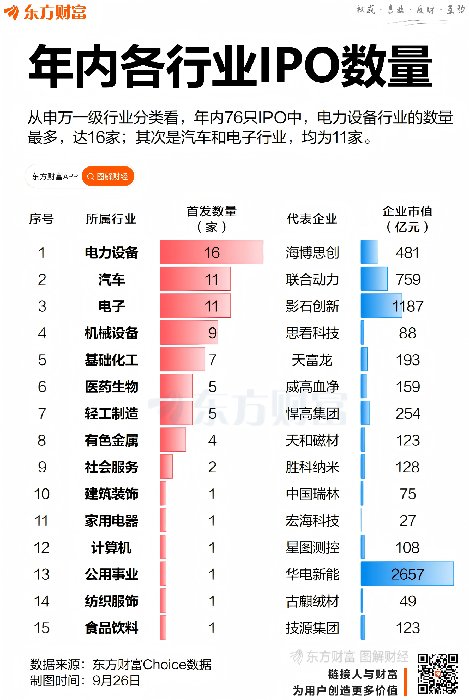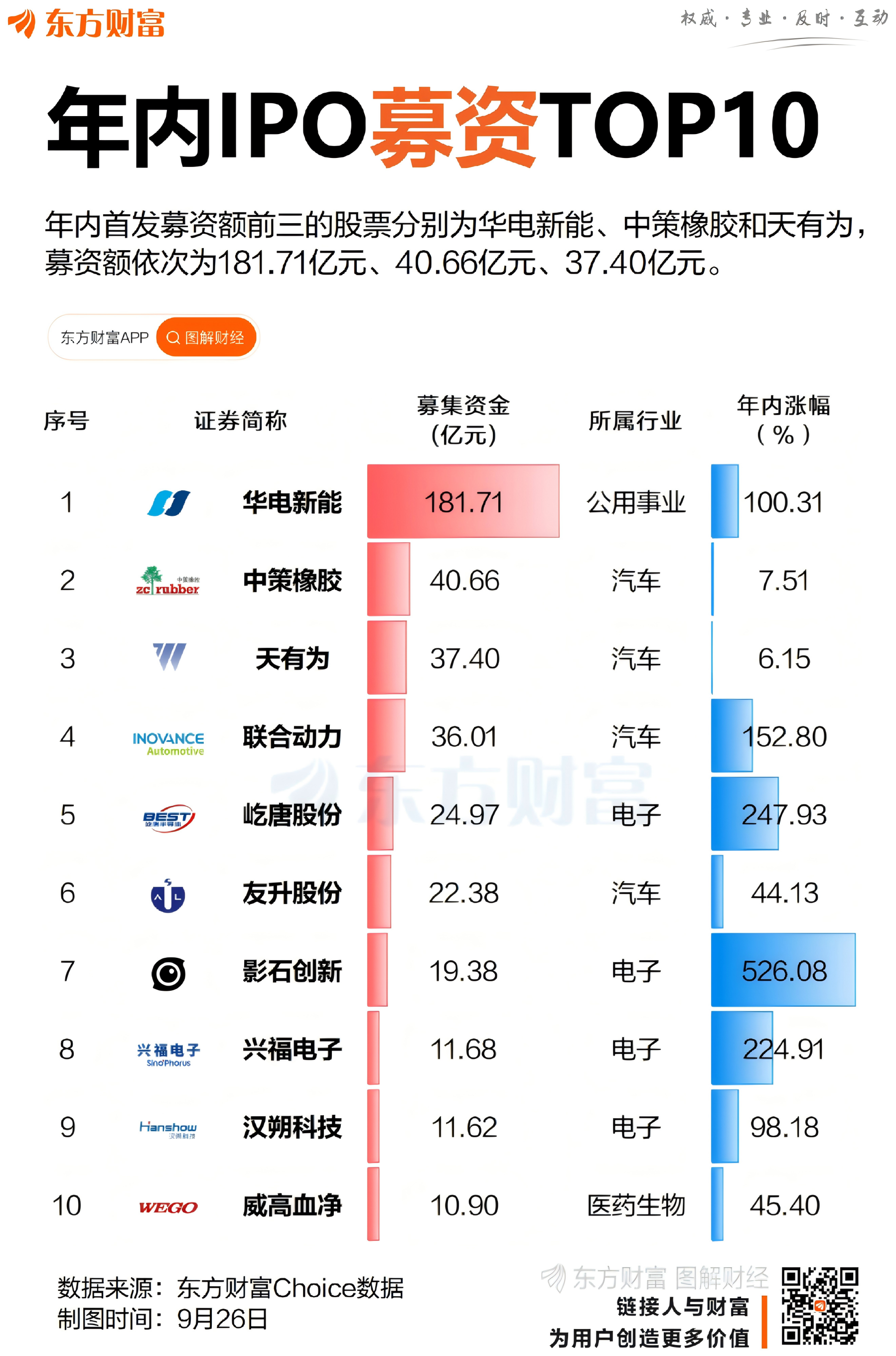 随着近期新股的集中上市,今年A股IPO募资额已超过去年全年。据东方财富Choice数据,截至9月26日,今年A股共有76只新股上市,首发募资额合计745亿元,已超2024年全年(668亿元)。