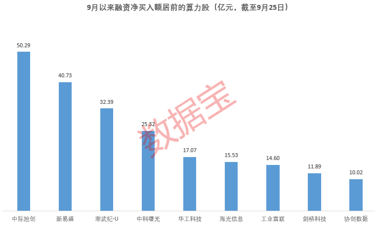 证券时报·数据宝梳理了9月(截至9月25日)融资净买入额居前的算力股,供读者参考。其中,融资净买入额超过10亿元的个股有9只,中际旭创新易盛寒武纪-U中科曙光排名前四,对应金额依次为50.29亿元、40.73亿元、32.39亿元、25.32亿元。