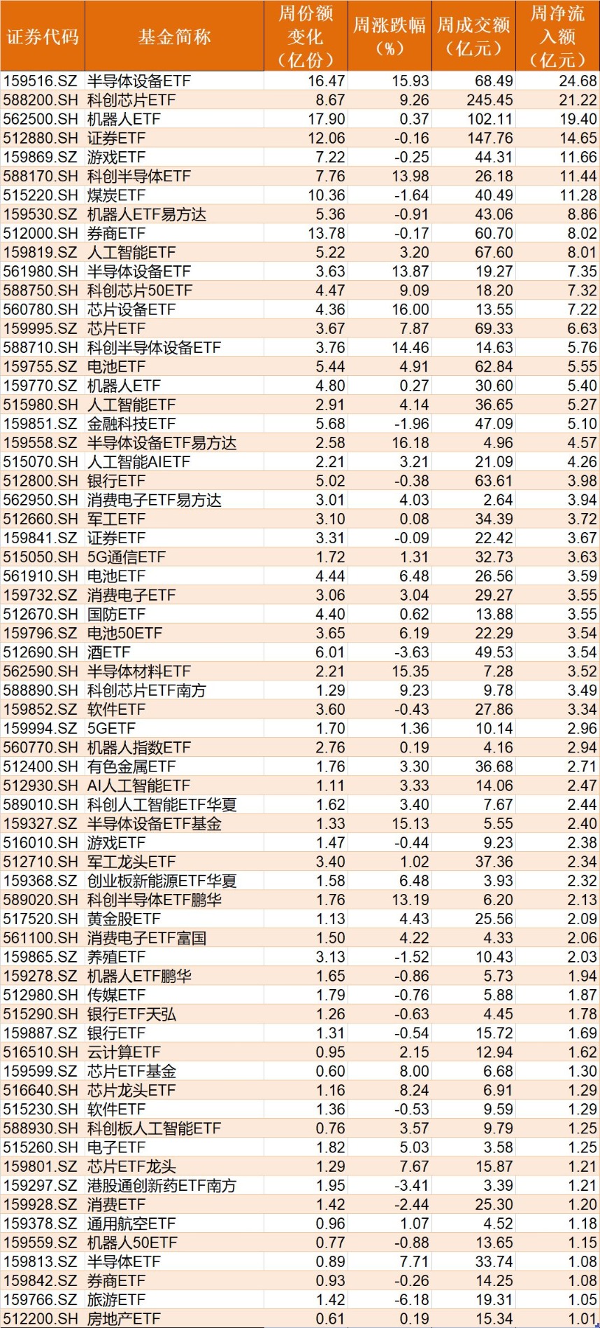 在行业主题ETF方面,本周净流入资金超1亿元的基金有66只,其中半导体设备ETF、科创芯片ETF和机器人ETF分别增加了16.47亿份、8.67亿份和17.9亿份,净流入资金24.68亿元、21.22亿元和19.4亿元。