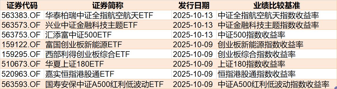 目前有8只ETF披露节后发行,跟踪标的有航空航天、金融科技、中证500、创业板新能源等。