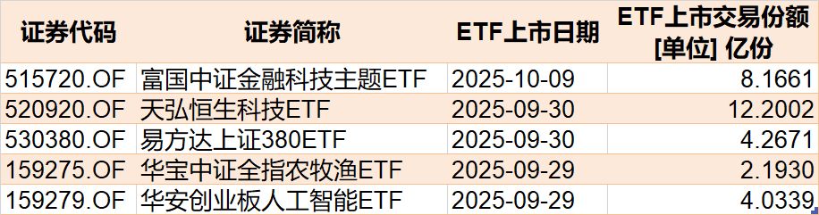 目前有4只ETF披露下周上市,跟踪标的为创业板人工智能、恒生科技、上证380、农牧渔等。