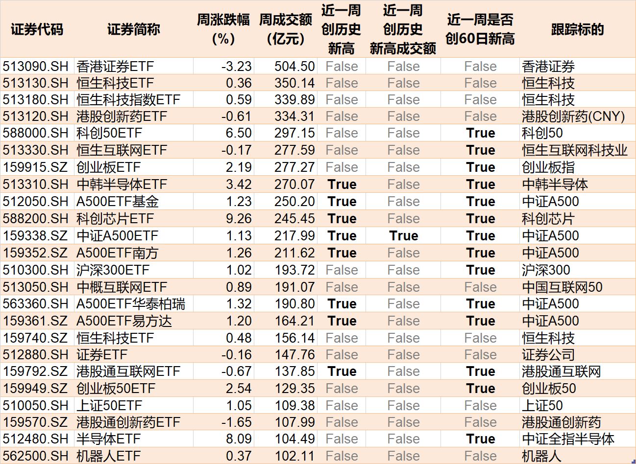 本周,股票型ETF和跨境型ETF成交额超100亿元的ETF有24只。