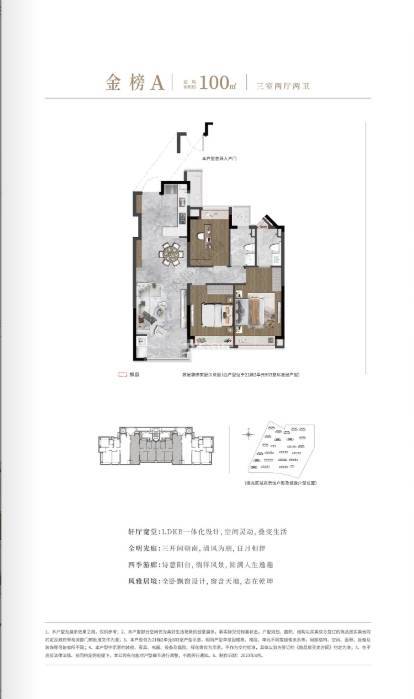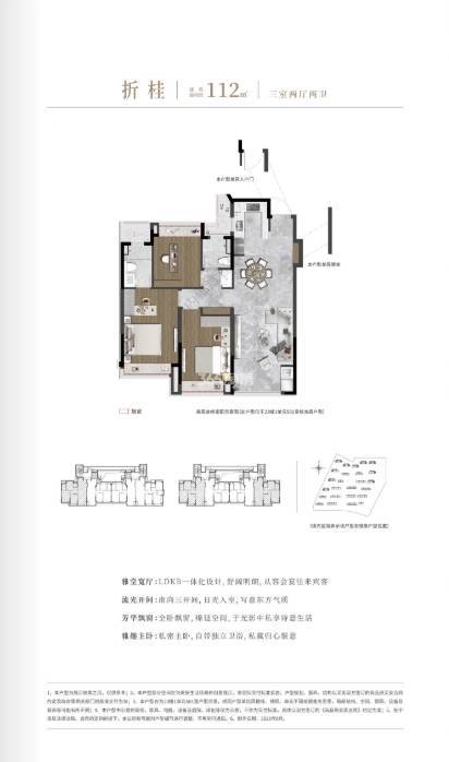 小高层100㎡户型:两梯四户,三室两厅两卫设计,LDKB 设计,主卧套间设计,客厅3.5米,主卧和次卧分别是3.2米和2.9米,朝南采光良好。大高112㎡户型:两梯四户,三室两厅两卫设计,户型方正,全明采光,入户独立玄关,厨房与餐厅一体化设计,客厅3.6米,主卧和次卧分别是3.3米和3米。