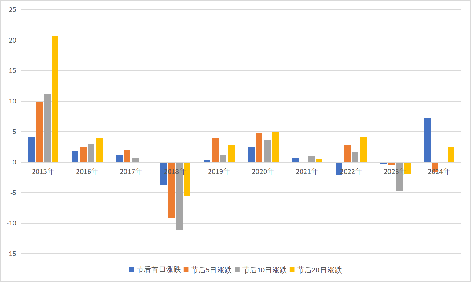 数据显示,过去十年间,万得全A指数节后1日、5日、20日上涨概率均为70%,节后10日上涨概率为80%,但是不同年份节后各个时间段内的涨跌情况并不完全一致。以2024年为例,万得全A指数节后首日大涨7.14%,节后5日反而下跌1.57%,节后10日和节后20日分别上涨0.06%和2.43%。