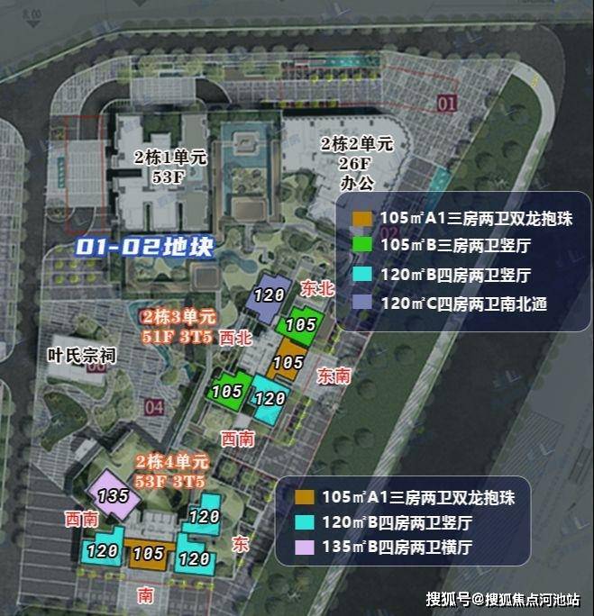 规划为4栋超高层塔楼,2栋一单元住宅174米53层,2栋二单元办公130米27层,2栋三单元住宅168米51层,2栋4单元住宅175米53层。规划872套,其中回迁544套+可售328套,停车位747个。