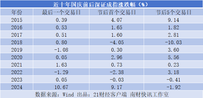 据21财经·南财快讯记者统计,节后市场表现通常更为积极。近十年数据显示,国庆节后首个交易日上证指数、深证成指上涨概率均为70%。节后5个交易日的上涨概率也整体较高,分别达到60%和70%。