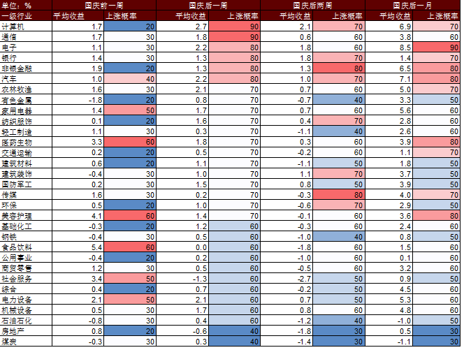 从近十年国庆节后行业表现来看,国庆后一周一级行业上涨概率多数在50%以上,其中上涨概率靠前的行业集中在计算机、通信、电子等行业,其中银行、非银金融、汽车在国庆后两周和国庆后一个月上涨概率仍然较高。