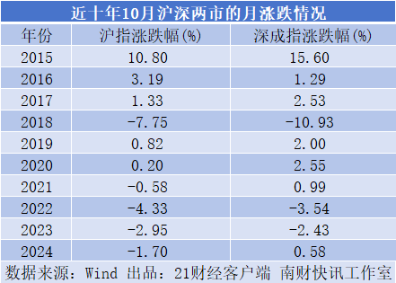 从近十年10月当月累计涨跌幅来看,沪指录得5年上涨、5年下跌;深成指则为7年上涨、3年下跌。指数月涨跌幅与10月首个交易日行情无明显关联。