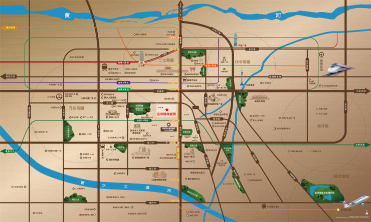 项目位处郑州城市发展黄金中轴–紫荆山路,周边商业、医疗、教育、金融等资源聚集,2公里范围近享醇熟生活,橄榄城都市广场、二七万达等商圈在侧;