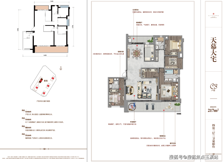 约3.6米层高,270度超大景观阳台,SPA泳池;中西式配套双厨房,120平奢阔客厅,尽显无界生活