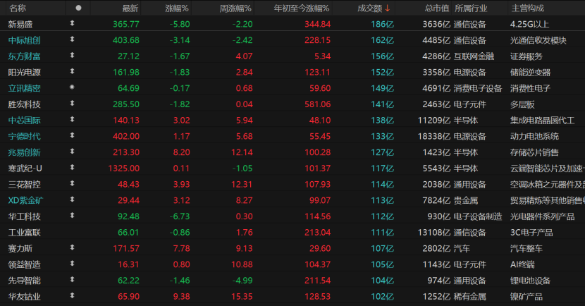 指数普涨,但个股涨跌互现,共有2657只个股飘红,63只个股涨停;2578只个股收跌,跌停股10只。今日成交额超过100亿元的共计18只,这些个股仍然以半导体通信设备电子元件等科技股为主。然而,新易盛中际旭创CPO概念股回调,昨日大涨的东方财富今日回调了1.67%,中芯国际兆易创新等个股表现亮眼。此外,华友钴业涨幅超过9%,表现突出。
