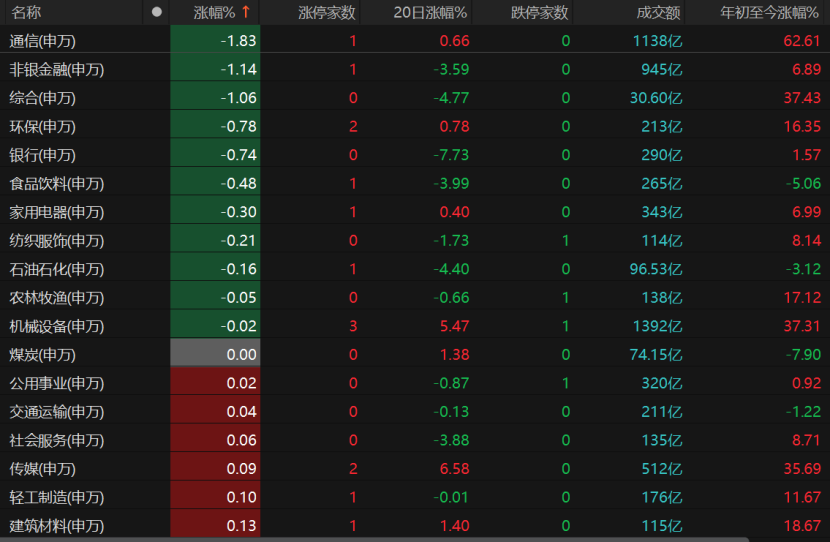 通信、非银金融、综合板块回调,跌幅超过1%;与此同时,环保、银行食品饮料、家用电器等传统股延续了弱势表现。