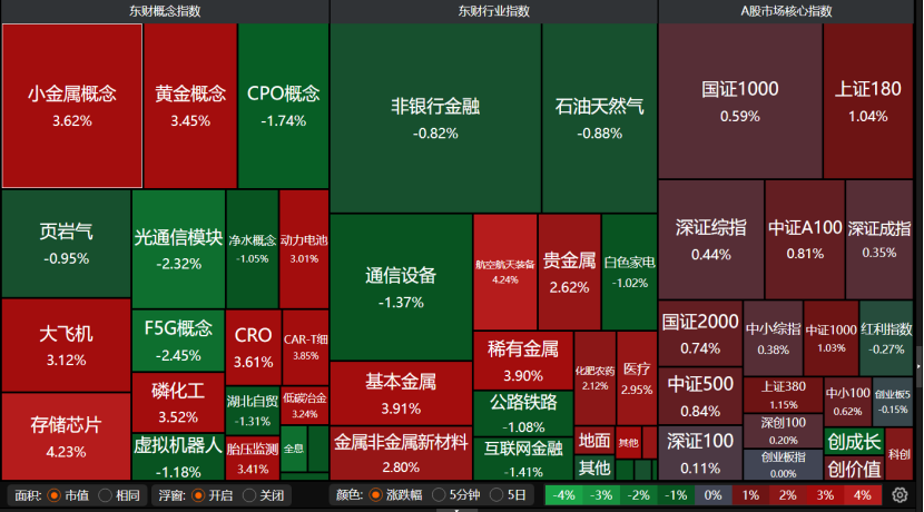 小金属概念黄金概念大飞机CRO概念、存储芯片等大涨,但CPO概念光通信模块F5G概念出现回调。