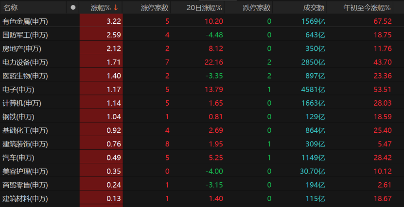 板块分化明显,有色金属、国防军工、房地产、电力设备领涨,医药生物、电子、计算机、钢铁板块涨幅超过1%。盛屯矿业江西铜业博迁新材精艺股份等个股涨停。