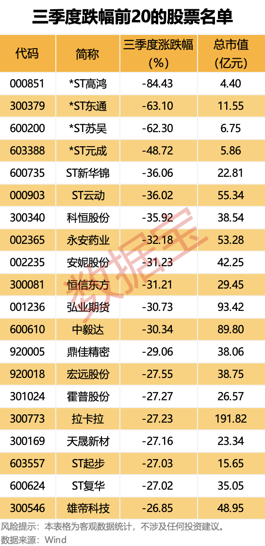 三季度跌幅居前的个股业绩表现普遍不佳,上述12股中,8股上半年业绩出现亏损情况,其余4股也出现归母净利润大幅下滑。其中,*ST高鸿、*ST元成、ST云动上半年亏损金额均超过1亿元。