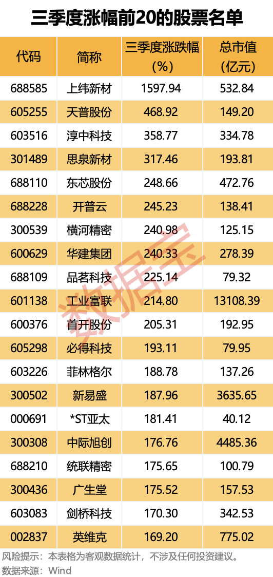 据证券时报·数据宝统计,剔除今年上市的次新股,共有93股三季度涨幅超过100%,上纬新材以1597.94%的涨幅居于榜首,天普股份、淳中科技、思泉新材紧随其后,分别上涨468.92%、358.77%、317.46%。