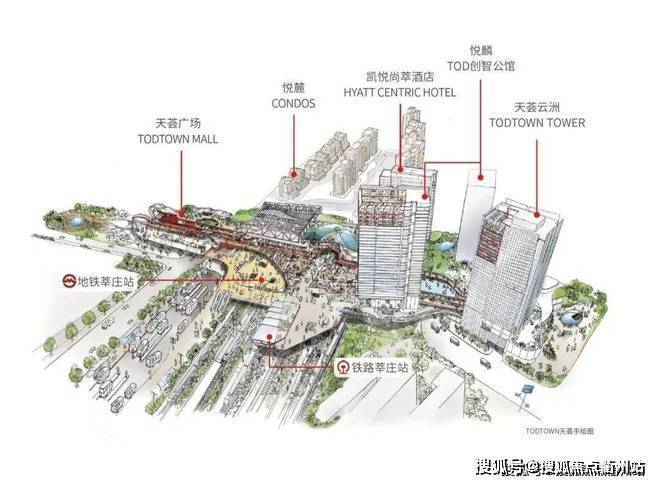 TODTOWN MALL天荟广场、超甲级写字楼TODTOWN TOWER天荟云洲、凯悦尚萃酒店、秘境大宅悦麓、无墙美术馆TODTIME时间廊与创智公馆TODTOWN天荟|悦麟,全维业态于此交织,实现“下楼即享繁华,上楼自在领地”, 物质繁华与精神丰盈共生共荣的理想之境。
